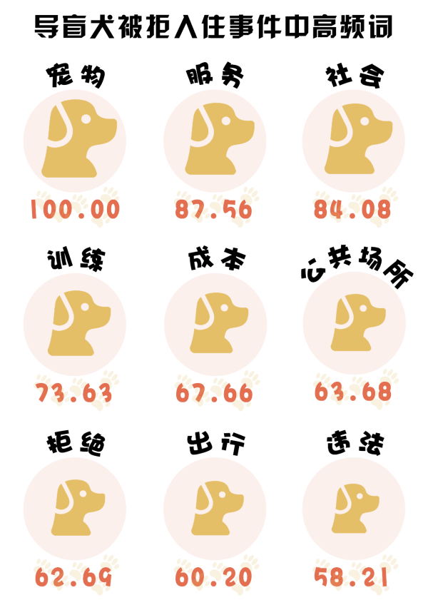 (數(shù)據(jù)來(lái)源:選取知乎話題“視障人士攜帶導(dǎo)盲犬入住全季酒店被拒,酒店的行為違法嗎?暴露出哪些問(wèn)題?”下的670個(gè)回答,做分詞及歸一化處理,進(jìn)行分詞后將熱度最高的詞語(yǔ)規(guī)定為100)