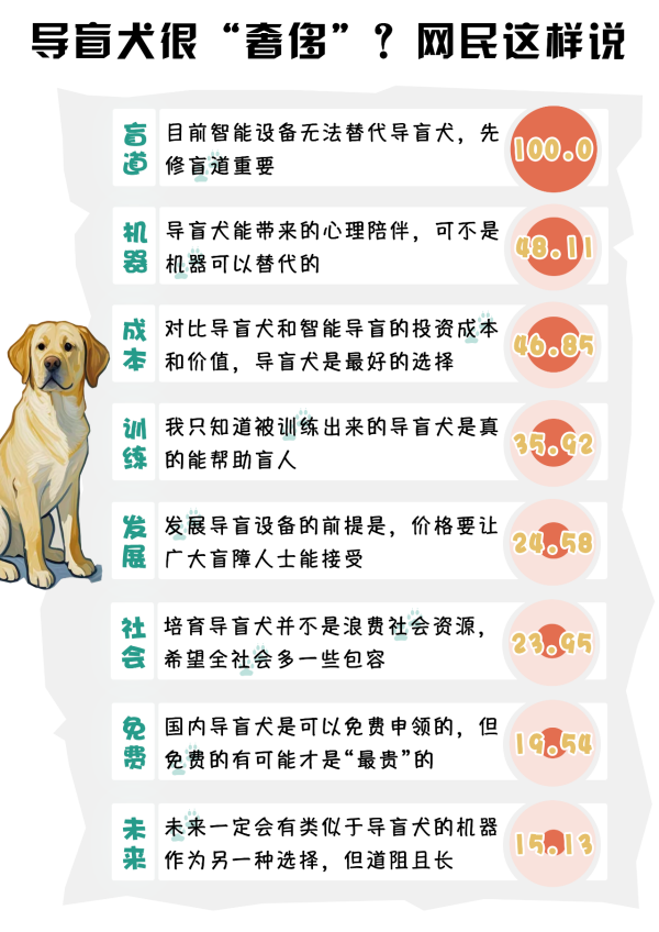 數(shù)據(jù)顯示,培訓(xùn)一條導(dǎo)盲犬的成本約20萬(wàn)元,有人戲稱其是“奢侈品”。其實(shí),導(dǎo)盲犬是免費(fèi)給視障人士使用的,其養(yǎng)護(hù)、醫(yī)療等成本與寵物犬相差并不大。輿論場(chǎng)中,網(wǎng)民對(duì)于導(dǎo)盲犬的價(jià)值討論呈現(xiàn)截然不同看法。
