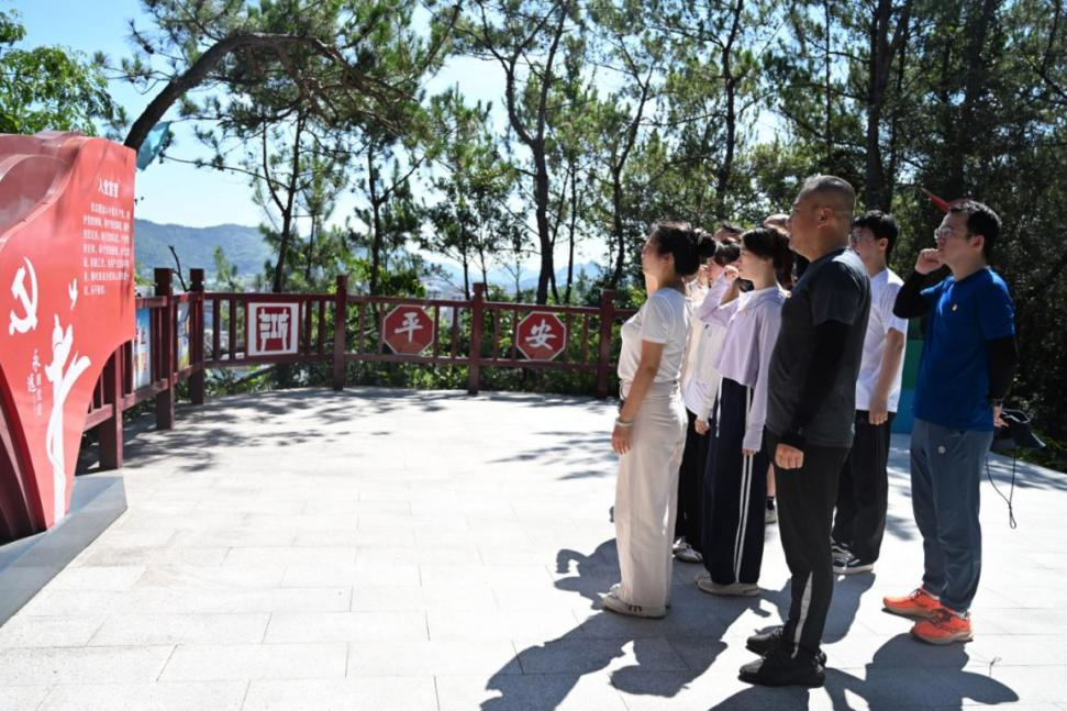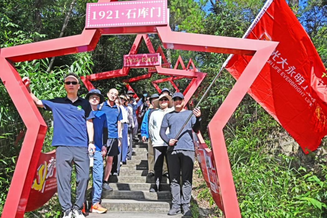 當(dāng)天上午,公園山步道入口,員工們沿著青石山道拾級(jí)而上,在司旗輕舞中,開(kāi)啟紅色傳承之旅。行過(guò)百十臺(tái)階,一座由五個(gè)紅五星拱門(mén)組成的長(zhǎng)廊掩映于青山綠翠間,百年黨史濃縮在長(zhǎng)廊兩邊紅色飄帶形狀的黨建墻之上。一行人如同穿梭于時(shí)光隧道,經(jīng)過(guò)“1921石庫(kù)門(mén)”“1934長(zhǎng)征門(mén)”“1949解放門(mén)”“1978幸福門(mén)”最終到達(dá)“2021復(fù)興門(mén)”。沿途,大家不時(shí)駐足,認(rèn)真閱讀紅墻上記載的從黨的一大至十九大會(huì)議的歷史沿革,學(xué)習(xí)感悟紅船精神、長(zhǎng)征精神、紅巖精神、遵義會(huì)議精神、抗美援朝精神以及抗洪、抗震、抗疫等黨的各個(gè)時(shí)期所體現(xiàn)的革命精神和自強(qiáng)不息的奮斗精神。行程中,面對(duì)莊嚴(yán)的入黨誓詞墻,黨員們重溫入黨誓詞儀式。站在觀景平臺(tái)遠(yuǎn)眺,員工們感慨于新農(nóng)村建設(shè)欣欣向榮的景象,找尋著綠色映襯下遠(yuǎn)處甬城的最高樓,深切體會(huì)到“美好生活”背后承載的錚錚諾言和肩負(fù)的責(zé)任。