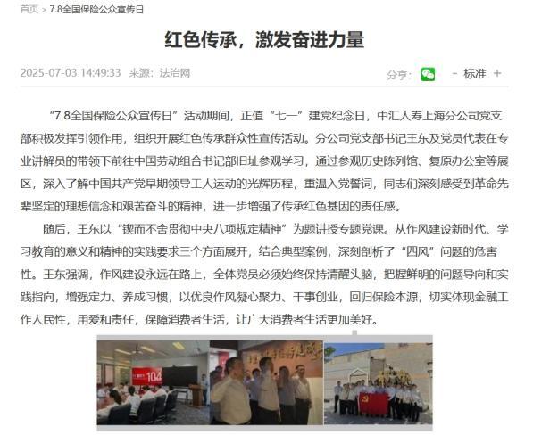 積極與外部媒體溝通合作,投稿文案、視頻等宣傳素材。在財(cái)經(jīng)網(wǎng)、法治日?qǐng)?bào)、搜狐網(wǎng)、新浪網(wǎng)等平臺(tái)發(fā)表多篇關(guān)于公司在“7.8全國保險(xiǎn)公眾宣傳日”活動(dòng)期間的報(bào)道,內(nèi)容涵蓋公司的各項(xiàng)活動(dòng)舉措、風(fēng)險(xiǎn)提示文章、紅色傳承活動(dòng)、公益活動(dòng)成果等。