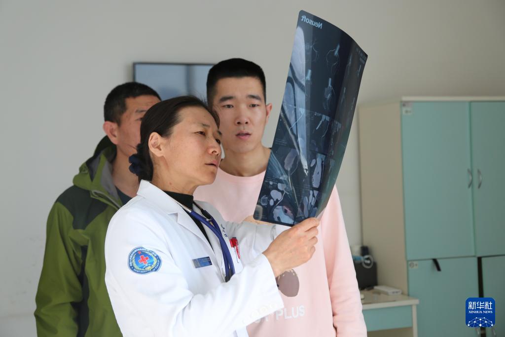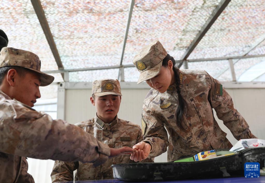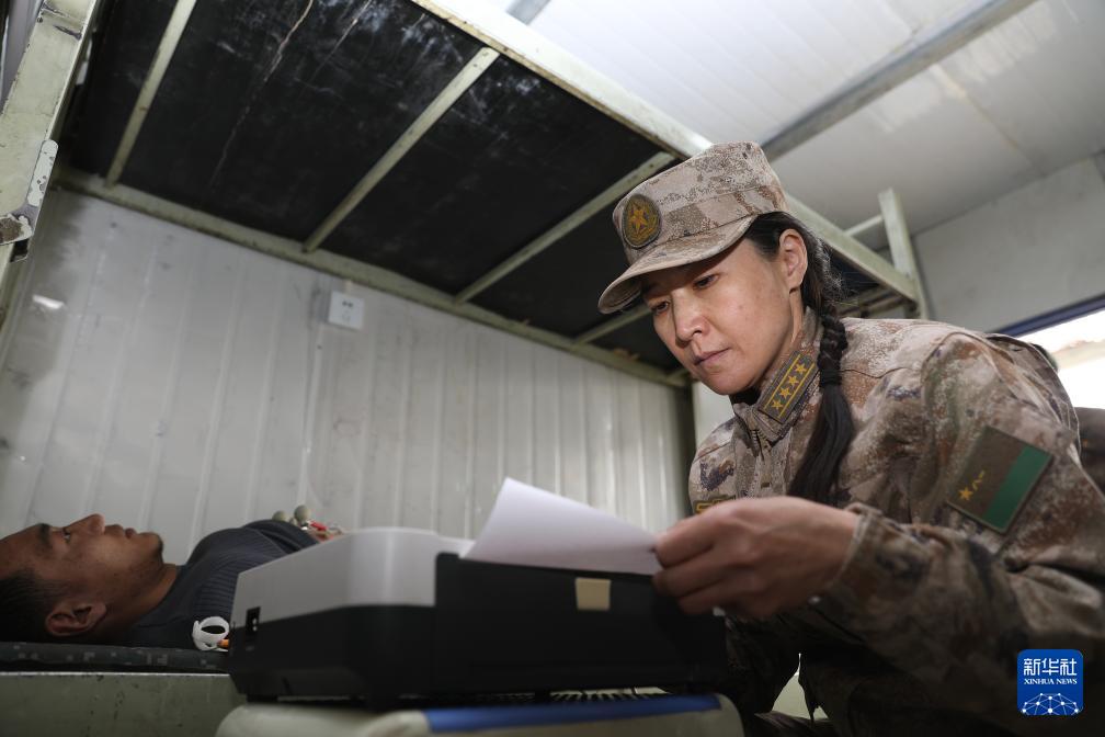 聯(lián)勤保障部隊第941醫(yī)院重癥醫(yī)學(xué)科主任張瑛(右)在邊防哨所巡診(2022年3月20日攝)。新華社發(fā)(孟釗 攝)