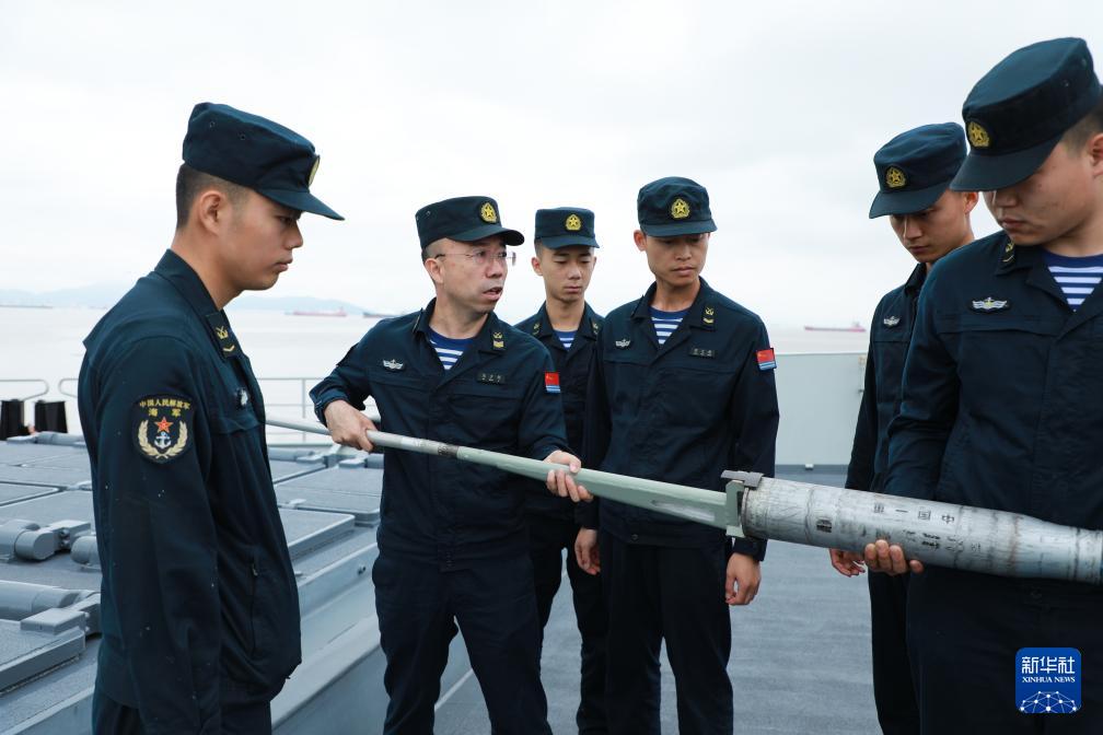 海軍資陽艦主炮區(qū)隊長馬少利(左二)向戰(zhàn)友演示專業(yè)工具使用方法(6月11日攝)。新華社記者 李秉宣 攝