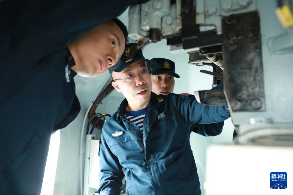 海軍資陽艦主炮區(qū)隊長馬少利(中)帶領(lǐng)戰(zhàn)友進(jìn)行裝備檢視(6月11日攝)。新華社記者 李秉宣 攝