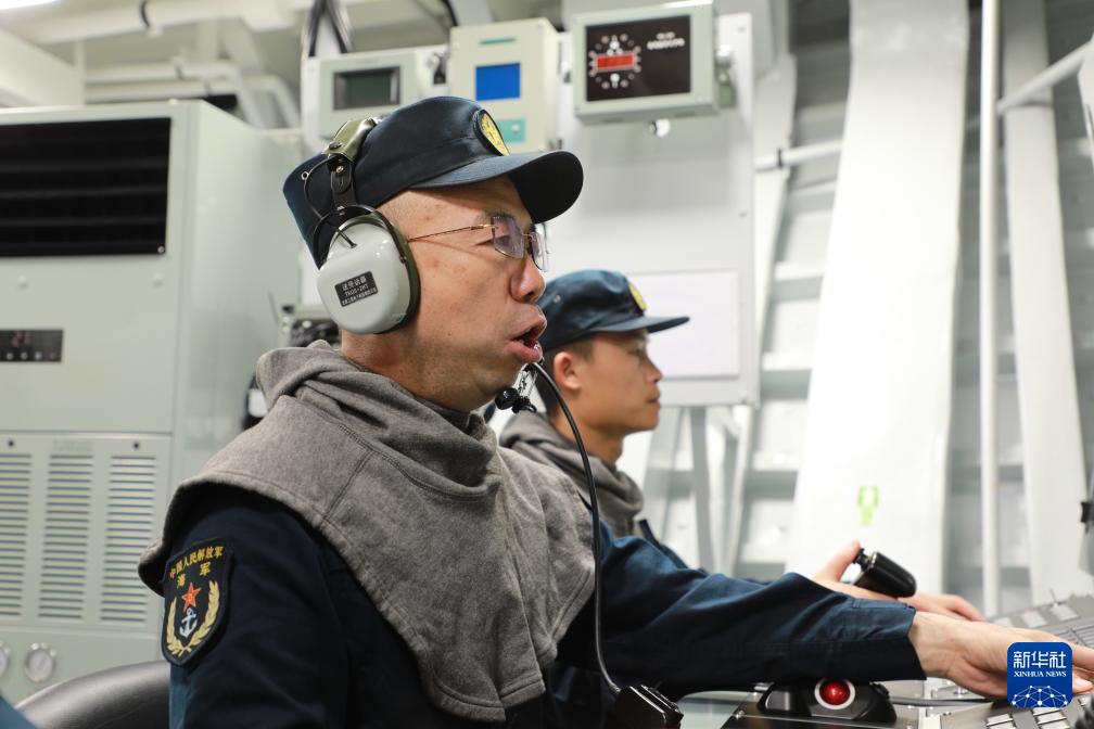 海軍資陽艦主炮區(qū)隊長馬少利(左)帶領(lǐng)戰(zhàn)友開展戰(zhàn)位操演(6月13日攝)。新華社記者 李秉宣 攝