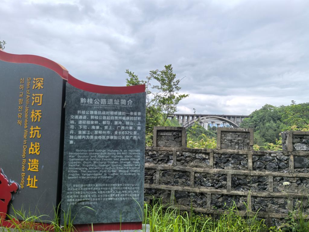 獨(dú)山縣位于黔桂交界,是貴州南大門??箲?zhàn)期間,獨(dú)山縣是貴陽、重慶的前沿戰(zhàn)略重鎮(zhèn)。深河橋地處獨(dú)山縣城北約9公里處,是一座古老的單孔石橋,始建于明隆慶年間。徐霞客在其游記中記載:“有澗自東谷走深崖中,兩崖石壁甚逼,澗嵌其間甚深,架石梁其上,為深河橋。”