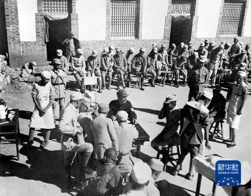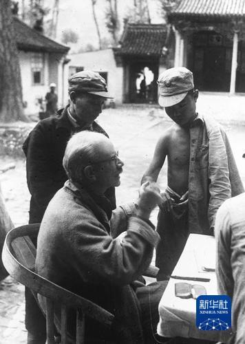 白求恩在晉察冀邊區(qū)醫(yī)院為準(zhǔn)備出院的八路軍傷病員檢查身體。沙飛 攝