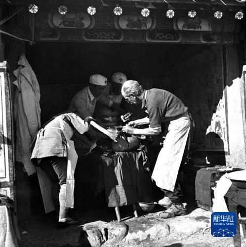 白求恩在晉察冀邊區(qū)淶源縣臨時(shí)手術(shù)室里為傷員做手術(shù)。吳印咸 攝