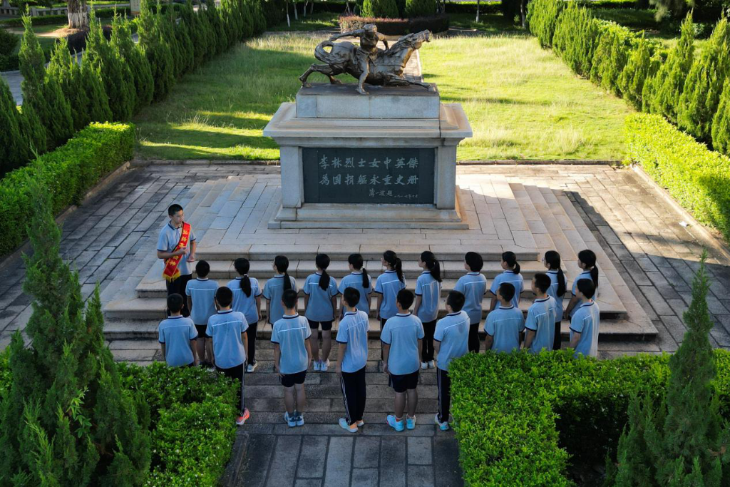 ↑福建省廈門集美中學(xué)李林園內(nèi),講解員為同學(xué)們介紹李林的事跡。(無人機照片)鐘煒俊攝