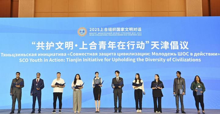 這是在2025上合組織國家文明對話現(xiàn)場拍攝的“共護文明·上合青年在行動”天津倡議發(fā)布環(huán)節(jié)(2025年7月23日攝)。新華社記者 李然 攝