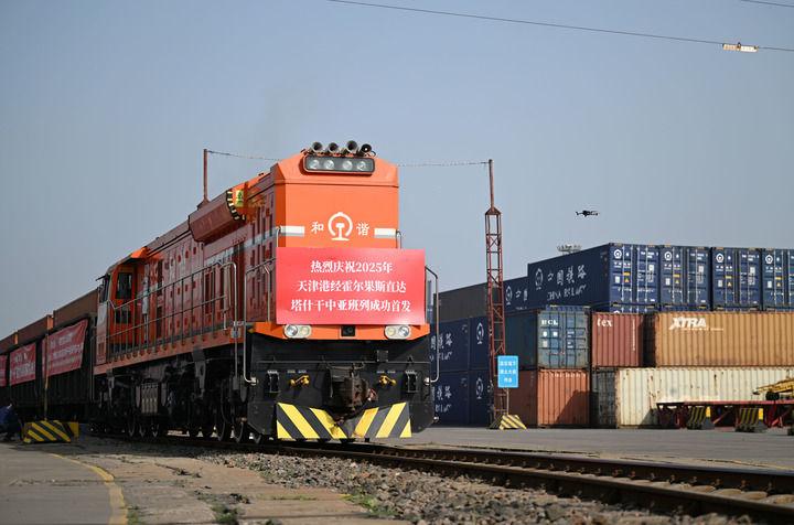 2025年首列天津港經(jīng)霍爾果斯直達(dá)塔什干的中亞班列從天津港物捷三堆場(chǎng)發(fā)車(chē)(2025年5月20日攝)。新華社記者 趙子碩 攝