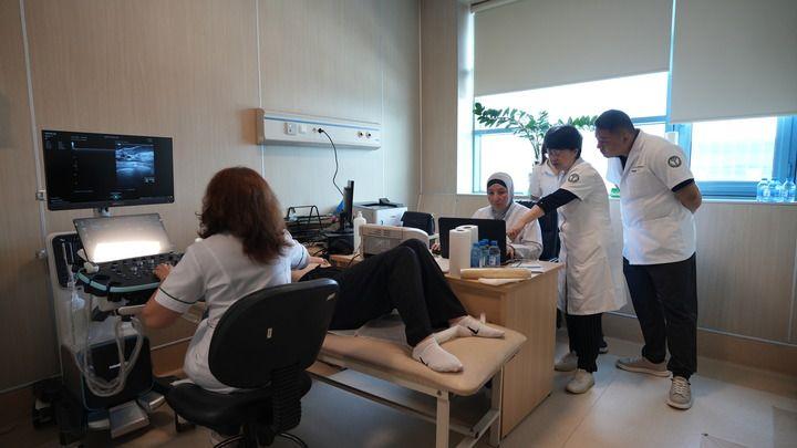7月16日,天津市抗癌協(xié)會(huì)、天津醫(yī)科大學(xué)腫瘤醫(yī)院的醫(yī)療隊(duì)專(zhuān)家在阿塞拜疆與當(dāng)?shù)蒯t(yī)院的超聲醫(yī)生聯(lián)合開(kāi)展乳腺癌篩查。宋瑞 攝