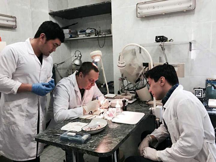 張超(左)在和俄羅斯學(xué)者一同進(jìn)行醫(yī)學(xué)實(shí)驗(yàn)。受訪者供圖