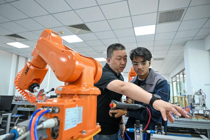 在天津現(xiàn)代職業(yè)技術(shù)學(xué)院魯班工坊實(shí)訓(xùn)教室,老師在課堂上教學(xué)生操作自動(dòng)化設(shè)備。新華社記者記者孫凡越 攝