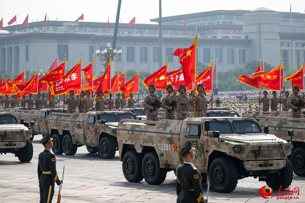 戰(zhàn)旗獵獵,鐵流滾滾。由80面抗戰(zhàn)英模部隊(duì)榮譽(yù)旗幟組成的戰(zhàn)旗方隊(duì)接受檢閱。