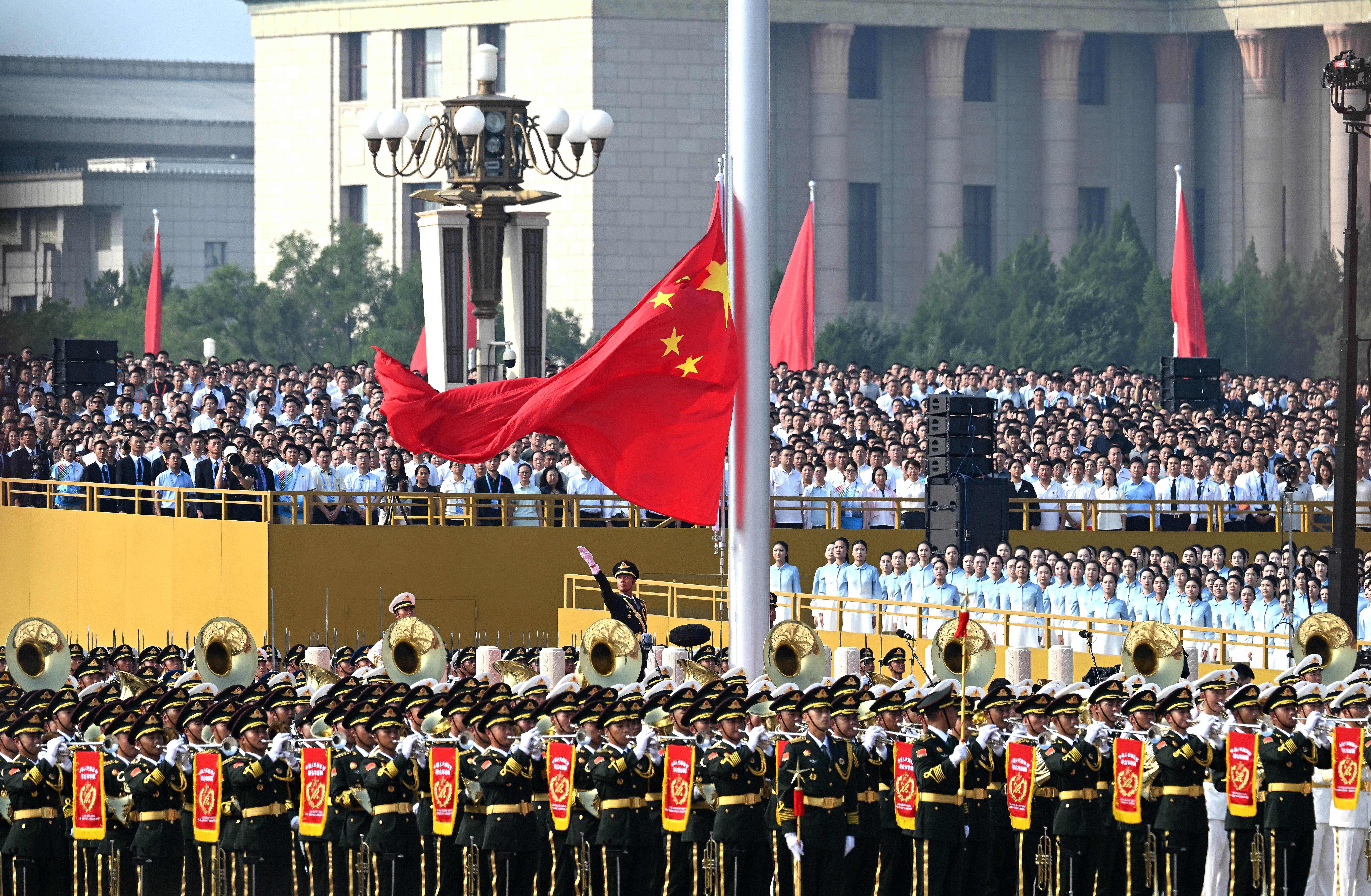 9月3日,紀(jì)念中國人民抗日戰(zhàn)爭暨世界反法西斯戰(zhàn)爭勝利80周年閱兵式在北京隆重舉行。這是天安門廣場舉行升國旗儀式。