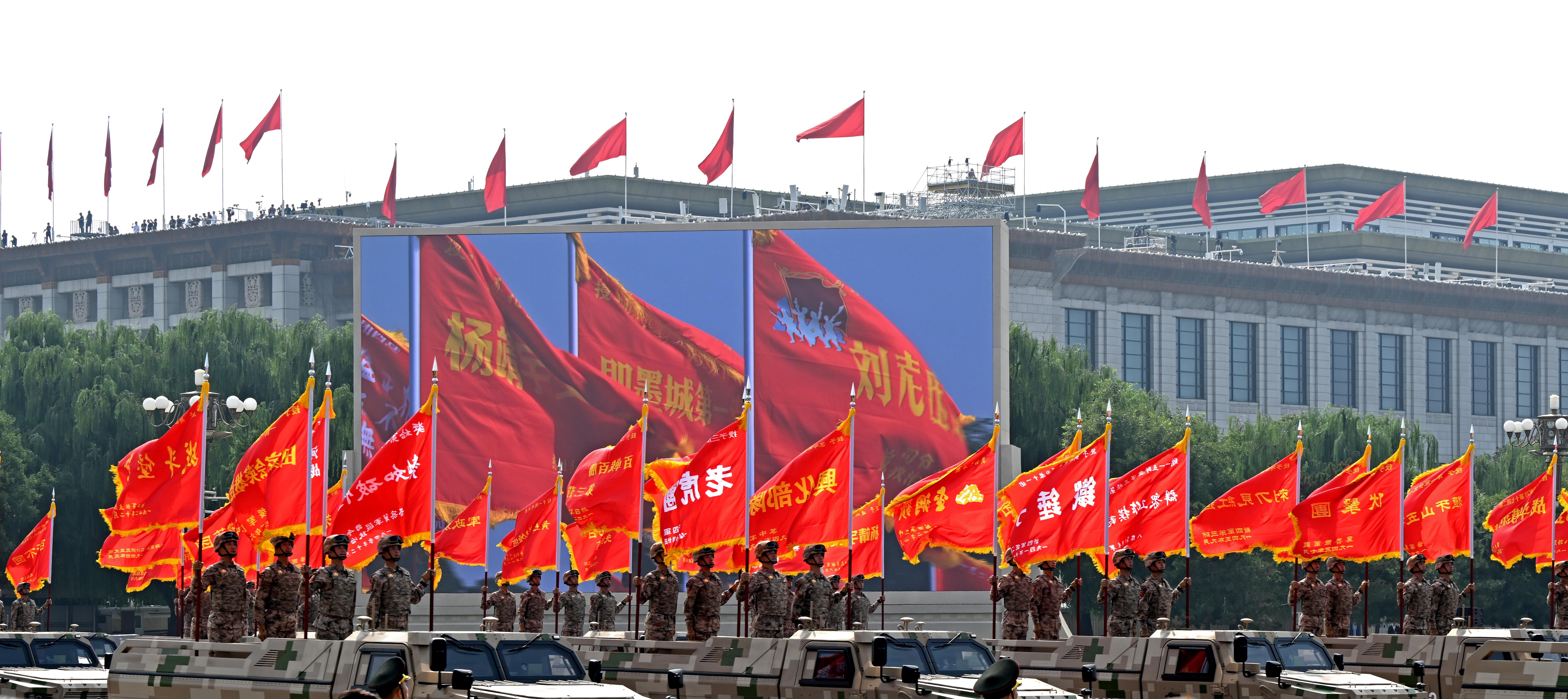由80面抗戰(zhàn)英模部隊(duì)榮譽(yù)旗幟組成的戰(zhàn)旗方隊(duì)接受檢閱。