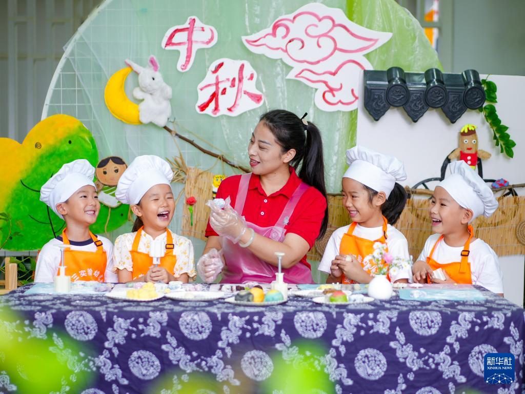 9月25日,在江蘇省泰州市姜堰區(qū)第三實(shí)驗(yàn)幼兒園,小朋友們在老師的指導(dǎo)下學(xué)習(xí)做月餅。
