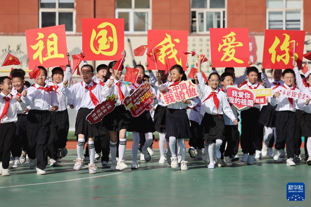 9月25日,在山東省臨沂市沂南縣,第三實(shí)驗(yàn)小學(xué)的小學(xué)生們參加“祝福祖國”活動(dòng)。