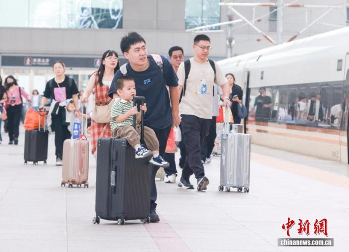 10月1日,國慶中秋假期首日,家長帶著孩子在北京北站乘車。當(dāng)日,中國鐵路迎來國慶中秋假期客流最高峰,預(yù)計(jì)發(fā)送旅客2300萬人次,計(jì)劃加開旅客列車2106列。中新社記者賈天勇攝