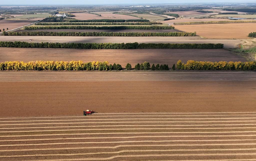 9月23日,在北大荒集團黑龍江格球山農(nóng)場有限公司大豆地塊,農(nóng)機在進行收獲作業(yè)(無人機照片)。新華社發(fā)(陸文祥攝)