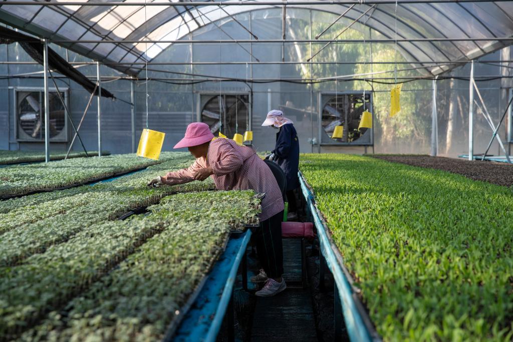 工作人員在云南省元謀縣的育苗工廠大棚內(nèi)進行育苗工作。受訪者供圖。