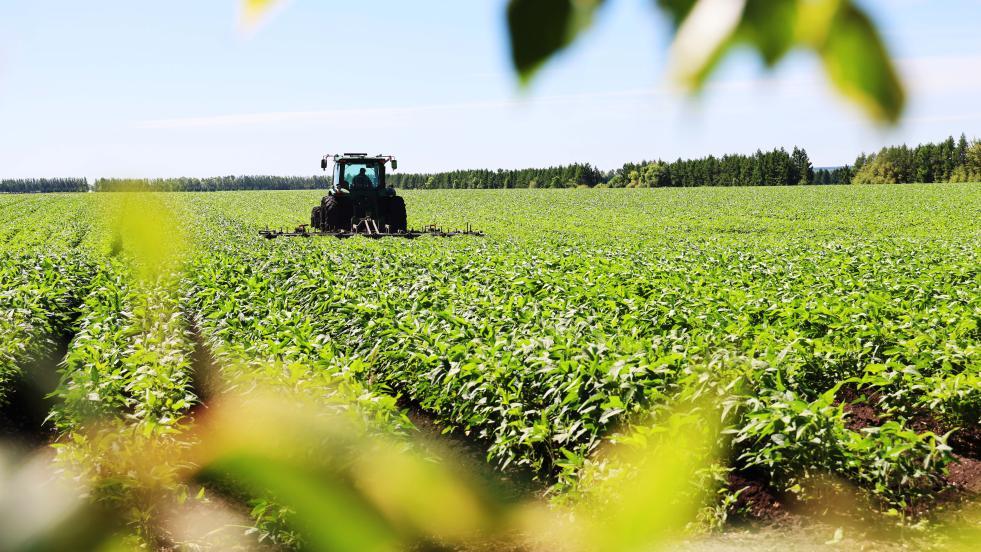 在北大荒集團黑龍江紅星農(nóng)場第一管理區(qū)有機大豆田里,搭載北斗導航系統(tǒng)的大馬力機車開展有機大豆二次中耕作業(yè)(2025年7月7日攝)。新華社發(fā)(侯越攝)