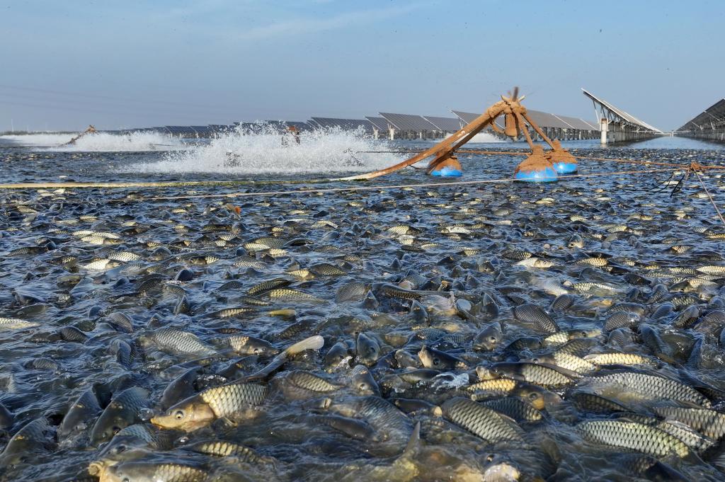 這是河北省唐山市豐南區(qū)黑沿子鎮(zhèn)“漁光一體”現(xiàn)代漁業(yè)產(chǎn)業(yè)園魚塘內(nèi)場景(無人機照片)。新華社記者 楊世堯 攝