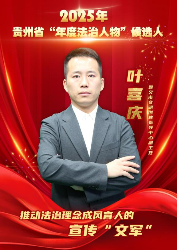 葉喜慶,現(xiàn)任貴州省遵義市文明創(chuàng)建指導中心副主任。2023年以來,他立足本職、守正創(chuàng)新,將法治理念、法治思維與法治方式融入精神文明建設各方面,以實際行動助推法治政府和文明遵義建設再上新臺階。