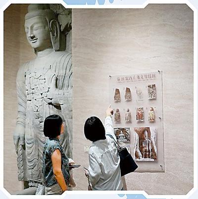 游客在3D打印的云岡石窟第20窟西立佛復(fù)原像前游覽。 新華社記者 劉 穎攝