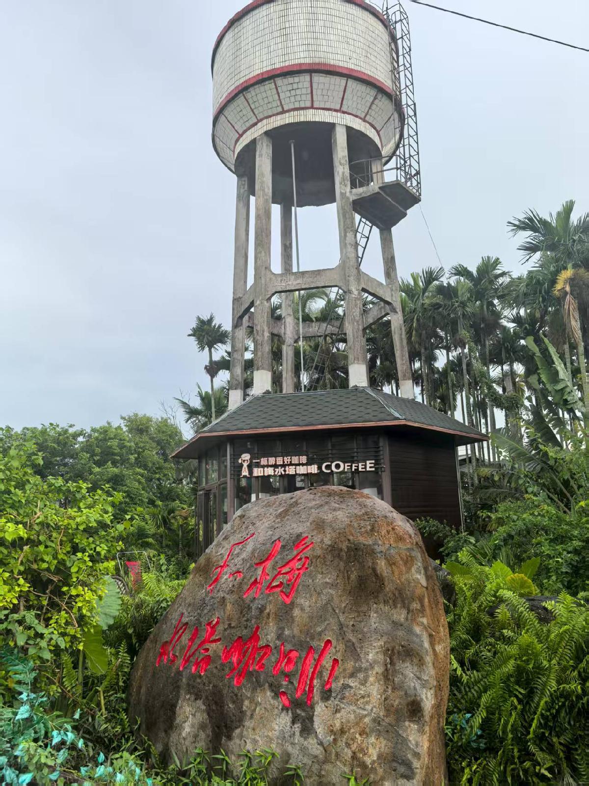 圖為海南省定安縣龍門鎮(zhèn)和梅村村口的水塔咖啡屋。
