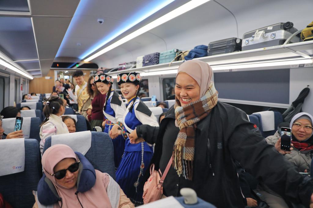 11月22日,在麗香鐵路動車組列車上,東南亞游客與身著民族服飾的乘務(wù)員一同跳舞。新華社發(fā)(楊紫軒攝)