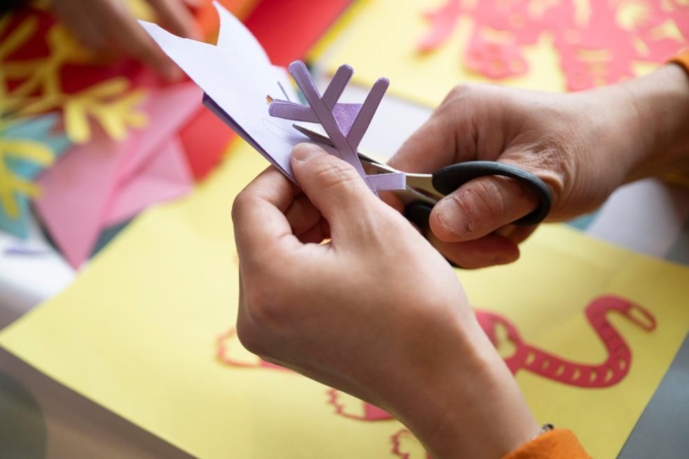 11月26日,游客在Y783次“悠享龍江·銀旅號”旅游列車上體驗(yàn)剪紙。新華社記者 張濤 攝
