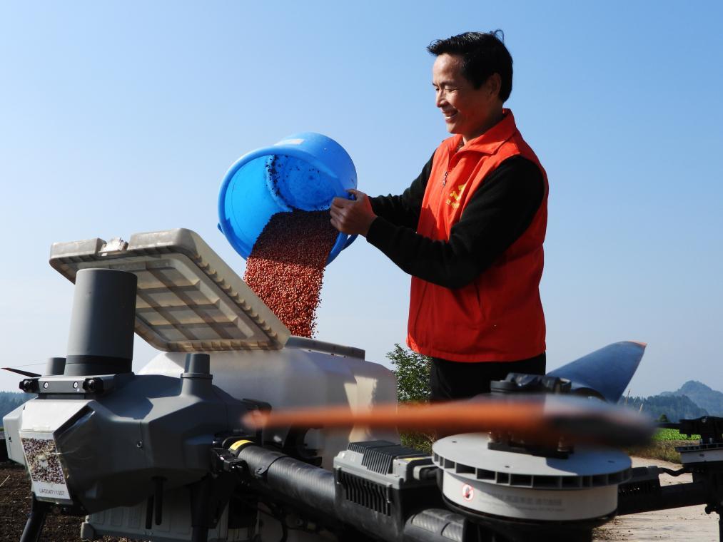 11月21日,農(nóng)機(jī)手在四川省達(dá)州市渠縣文崇鎮(zhèn)譚壩社區(qū)田間給植保無(wú)人機(jī)添加小麥種子,準(zhǔn)備進(jìn)行“飛播”作業(yè)。(鄧良奎 攝)