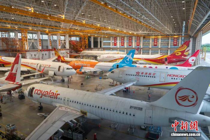 海南自貿(mào)港一站式飛機維修產(chǎn)業(yè)基地一片繁忙景象。(海航航空集團有限公司 供圖)