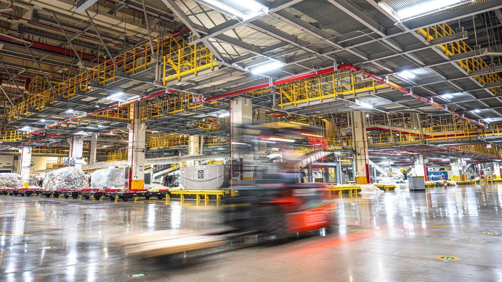 跟隨轉運車,記者來到了建筑面積達75萬平方米的機場“工”字形轉運中心。這里,“快點、快點”的催促聲與機器有節(jié)律的運行聲形成交響,在2萬多臺自動分揀設備和50多公里長傳送帶的支持下,工人們熟練地將數(shù)量規(guī)格不一的包裹抱起、分類、組合、打包,再拼裝出多個符合航空貨運規(guī)格和形狀要求的大包裹。