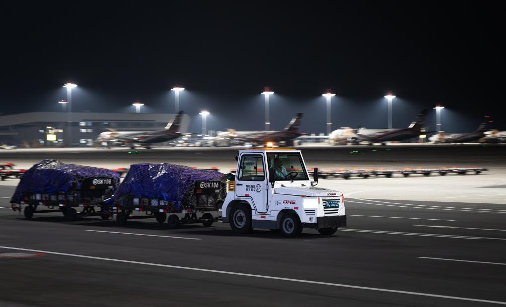 凌晨,貨物被轉運至鄂州花湖國際機場轉運中心進行分揀作業(yè)。新華社記者肖藝九 攝