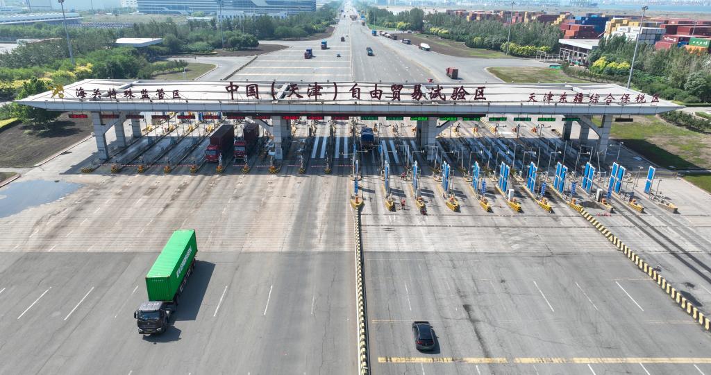 這是6月20日拍攝的天津自貿(mào)區(qū)天津港東疆片區(qū)入口處的中國(guó)(天津)自由貿(mào)易試驗(yàn)區(qū)海關(guān)特殊監(jiān)管區(qū)入口(無人機(jī)照片)。新華社記者 孫凡越 攝