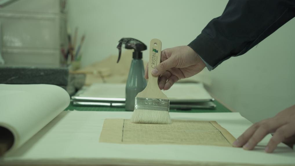 古籍修復師王泓杰正在修書。他用羊毫筆蘸少許小麥淀粉漿糊,微微浸潤蟲蛀洞口邊緣,隨后取紙覆蓋,手指摁緊,用鑷子將多余部分撕除。他的動作輕快準確,手指來回間,一個洞很快補好。