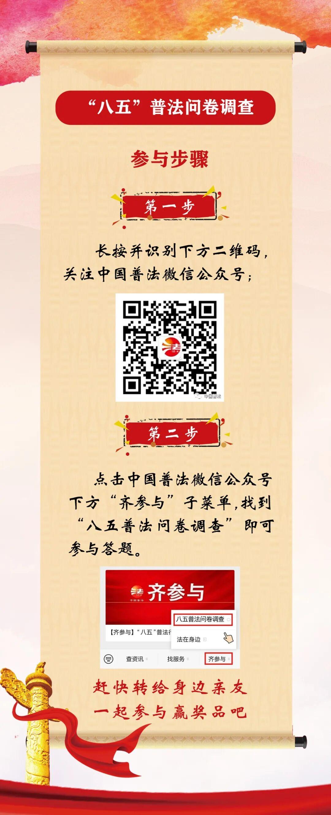 關(guān)注“中國普法”微信公眾號,點(diǎn)擊手機(jī)下方“齊參與”菜單,找到“八五普法問卷調(diào)查”,進(jìn)入問卷調(diào)查頁面即可。