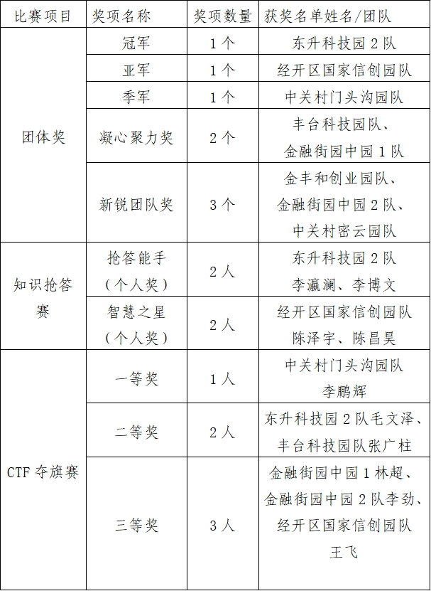 經(jīng)過多輪激烈角逐,最終決出了“智慧之星”“搶答能手”“CTF奪旗賽”個人獎,以及“凝心聚力獎”“新銳團隊獎”和團體冠亞季軍等10余個獎項。比賽結果公布如下,恭喜這些獲獎隊伍。