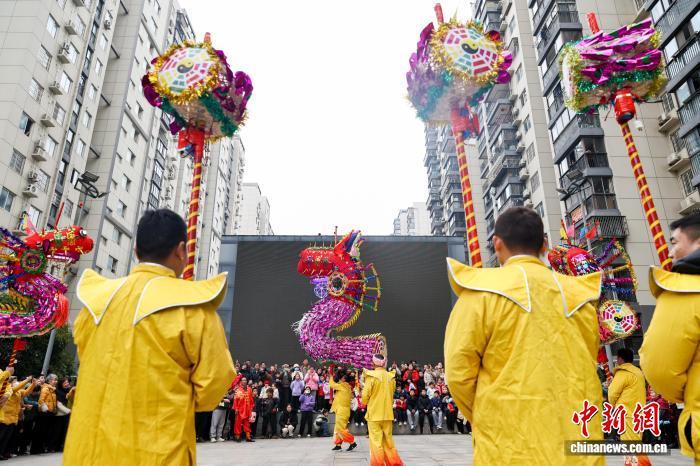 2月27日,湖北武漢,國家級非遺漢陽高龍走進社區(qū)進行表演,以傳統(tǒng)民俗為居民送上馬年元宵祝福。圖為高龍表演吸引民眾觀看。中新社記者 張暢 攝