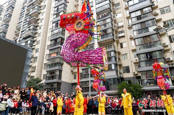 2月27日,湖北武漢,國家級非遺漢陽高龍走進(jìn)社區(qū)進(jìn)行表演,以傳統(tǒng)民俗為居民送上馬年元宵祝福。圖為高龍隊(duì)隊(duì)員們?yōu)榫用襁M(jìn)行表演。中新社記者 張暢 攝