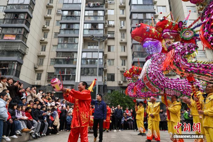 2月27日,湖北武漢,國家級非遺漢陽高龍走進社區(qū)進行表演,以傳統(tǒng)民俗為居民送上馬年元宵祝福。圖為高龍隊隊員們?yōu)榫用襁M行表演。中新社記者 張暢 攝