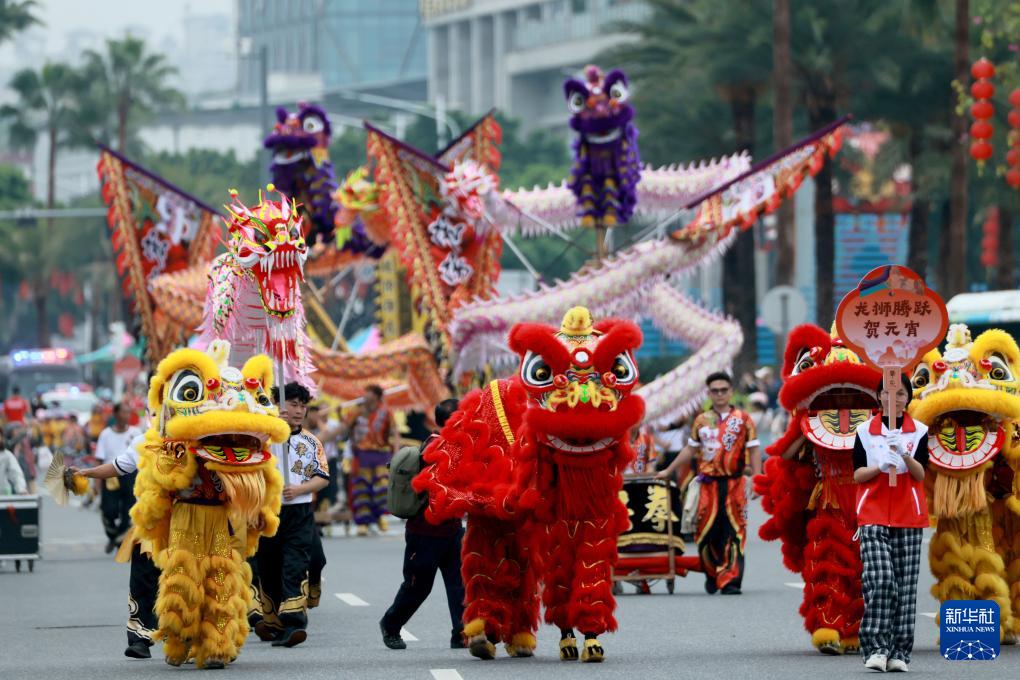 3月1日,廣東省肇慶市端州區(qū)舉行“廣府風(fēng)韻匯星湖 多彩非遺鬧元宵”2026肇慶廣府文化廟會非遺巡游展演活動。這是南獅表演。