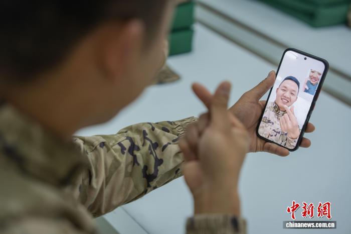 圖為武警官兵通過手機視頻向家人送上元宵節(jié)祝福。施晨洲 攝