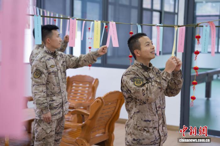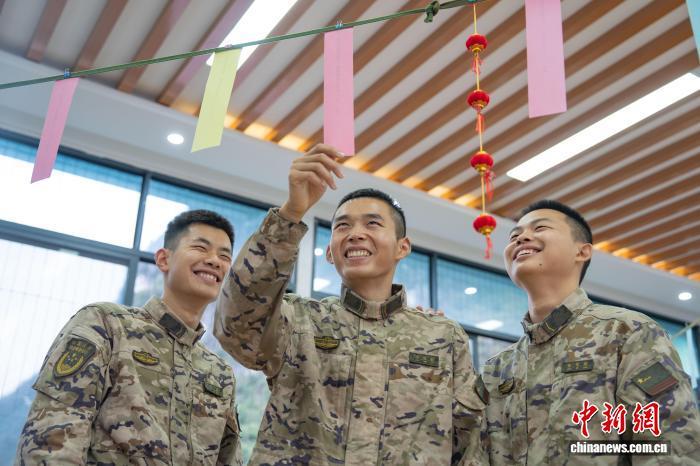 圖為武警官兵查看燈謎謎面。施晨洲 攝