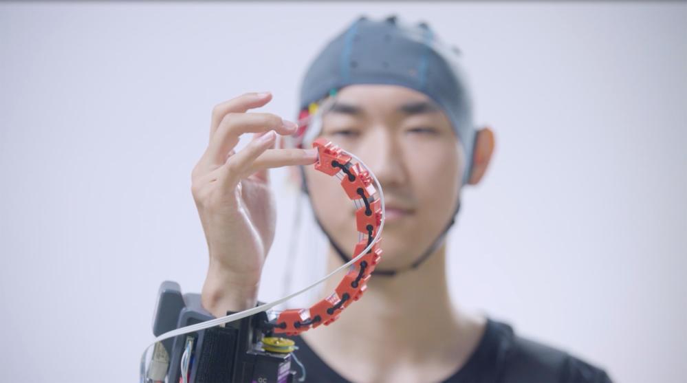 天津大學科研人員測試腦控外肢體(手部)康復機器人。新華社發(fā)