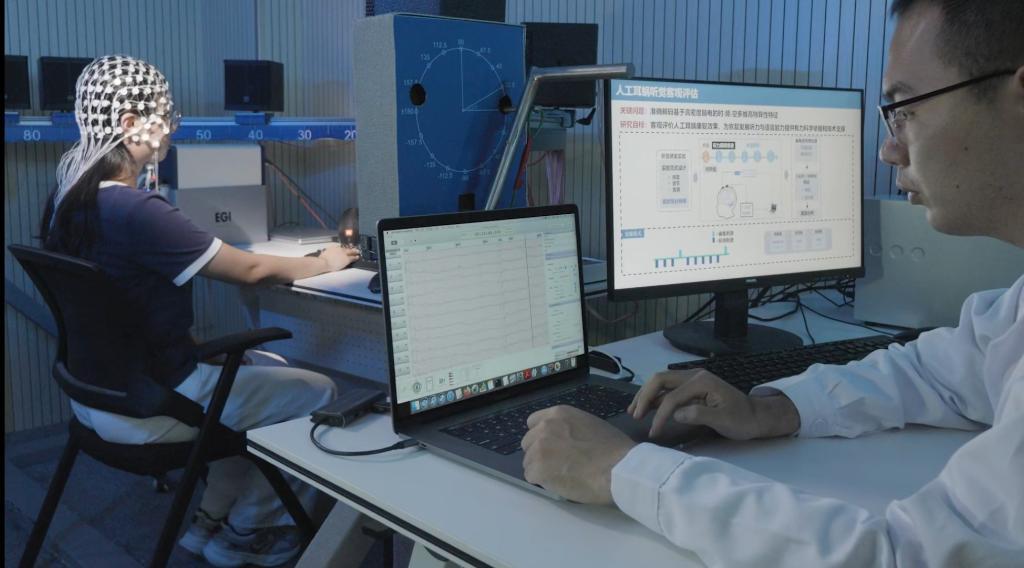 科研人員測試聽覺智能評估系統(tǒng)(視頻截圖)。新華社發(fā)