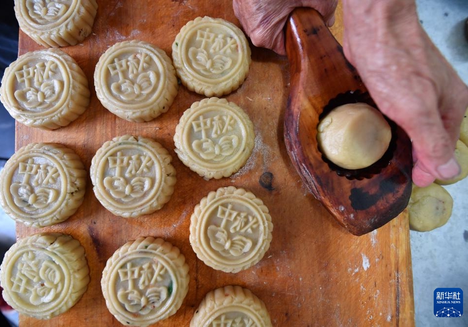 9月20日,在河北省石家莊市井陘縣天長(zhǎng)鎮(zhèn)的一家手工月餅作坊里,老師傅使用傳統(tǒng)手藝制作月餅……