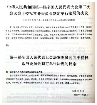 1955年7月30日,根據(jù)法案委員會的建議,一屆全國人大二次會議作出決定:“隨著社會主義建設和社會主義改造事業(yè)的進展,國家急需制定各項法律,以適應國家建設和國家工作的要求。在全國人民代表大會閉會期間,有些部分性質(zhì)的法律,不可避免地急需常務委員會通過施行。為此,特依照中華人民共和國憲法第三十一條第十九項的規(guī)定,授權常務委員會依照憲法的精神、根據(jù)實際的需要,適時地制定部分性質(zhì)的法律,即單行法規(guī)。”該決定改變了全國人大是行使國家立法權唯一機關的規(guī)定,是對1954年憲法的重要補充和發(fā)展。